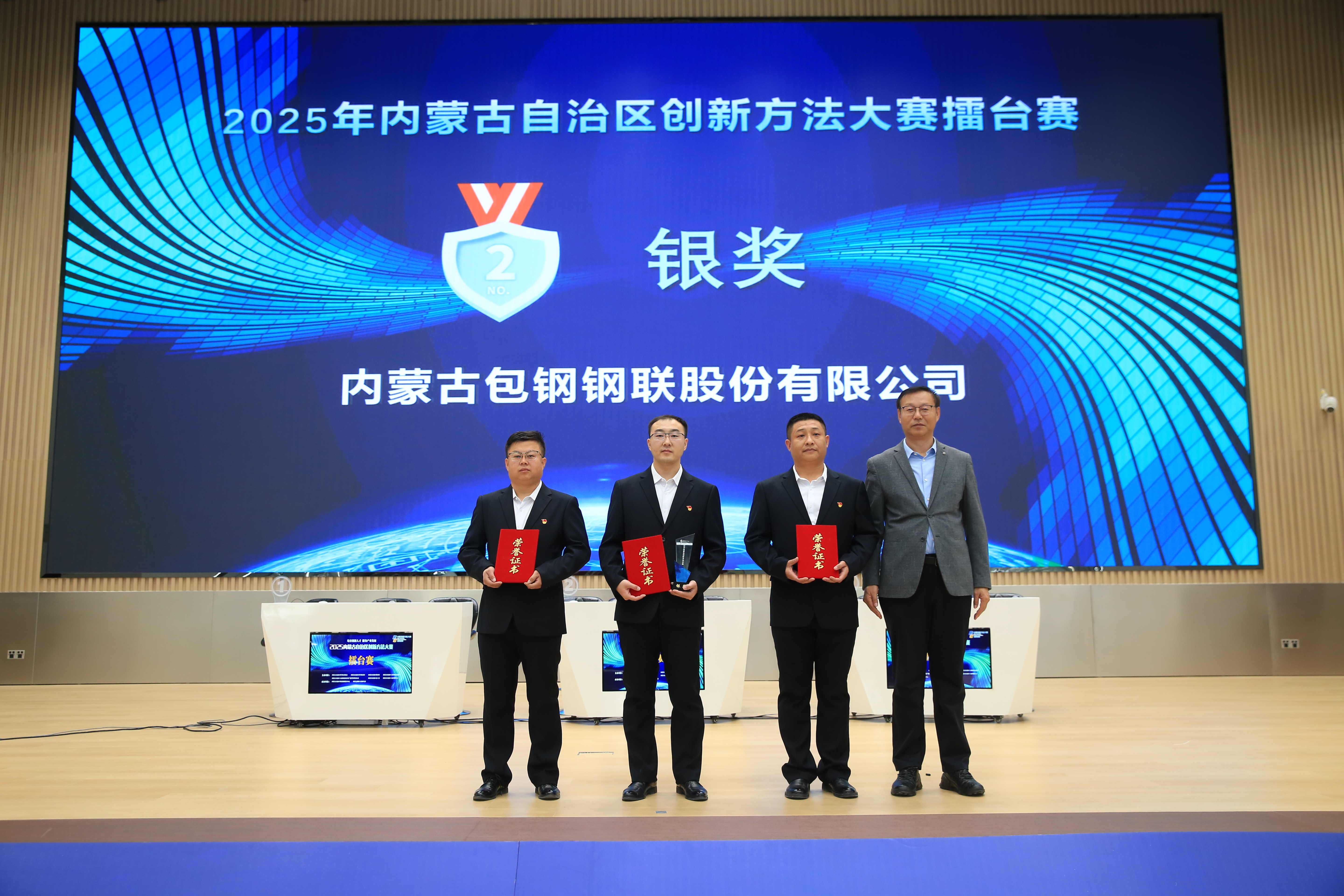 在颁奖仪式上,各主办单位相关负责同志为获得内蒙古赛区企业、高校专项赛一等奖,擂台赛金、银、铜奖的队伍,以及企业、高校专项赛优秀组织单位颁奖。
